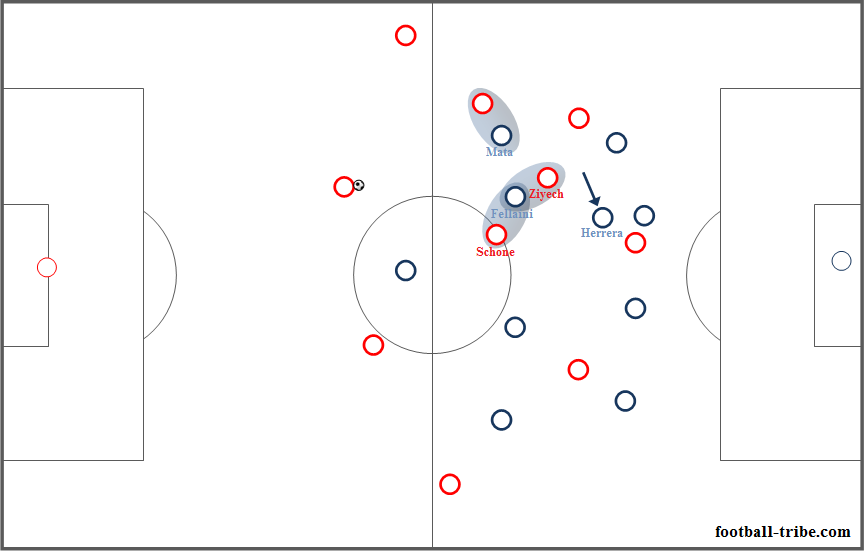 Herrera memutuskan mendekat ke area di mana duo bek tengah berada, karena ia merasa Fellaini dan Juan Mata cukup mampu mengatasi situasi dua lawan tiga yang terlihat dalam gambar di atas. Herrera memutuskan turun sedikit menyesuaikan posisinya untuk meningkatkan keamanan di depan duo bek tengah MU.