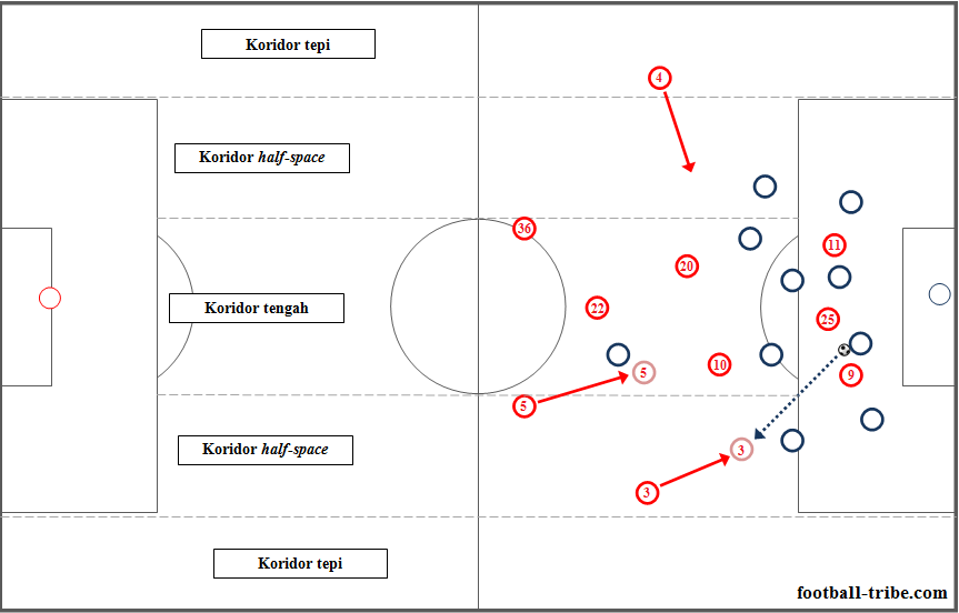 Kedua bek sayap (3 dan 4) masuk ke halfspace atau merapat sedekat mungkin dengan gelandang tengah ketika penyerang sayap berada jauh di depan. Fungsinya adalah untuk mempersempit ruang gerak lawan ketika lini belakang lawan membuang bola ke luar kotak penalti.