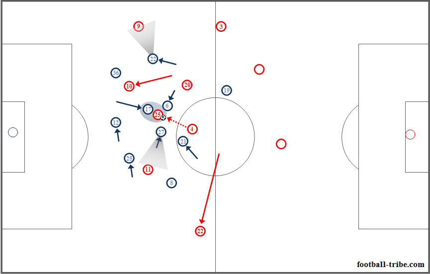 Bersama Ziyech, Traore bergerak dari sisi ke sisi untuk menciptakan overload yang kuat demi mendukung progresi serangan Ajax. Ketika keduanya masuk ke pos nomor 8, Klaassen yang bergerak naik mengisi pos nomor 10 di belakang penyerang. Sayangnya, selain kuatnya barikade MU di tengah, pengambilan posisi penyerang tengah (baik Dolberg maupun Traore kemudian) sering kali sejajar secara vertical dengan Klaassen, yang menyebabkan Ajax kehilangan aspek depth (kedalaman) dalam struktur posisional mereka.