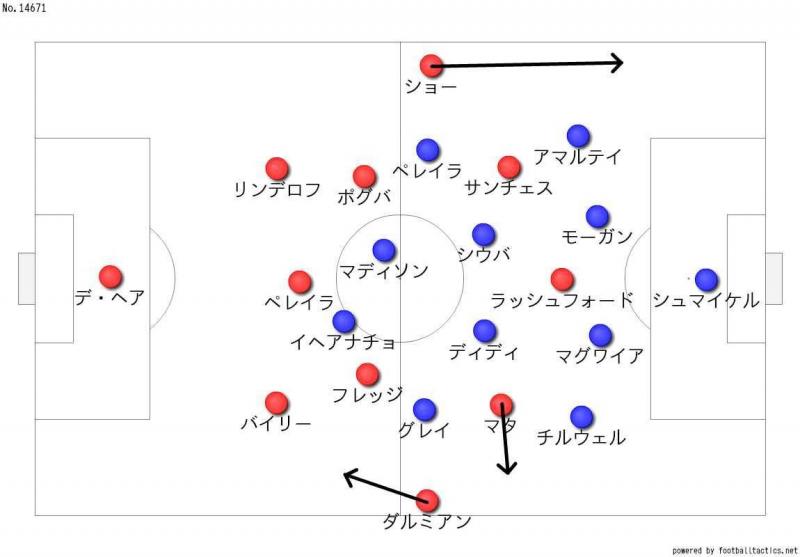 試合途中からは、マッテオ・ダルミアンがあまり高い位置をとらなくなり、右の幅はマタが、左の幅はショーがとる、アシンメトリーな形に変化した。