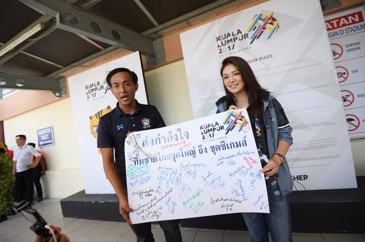 วทันยา วงษ์โอภาสี ผู้จัดการทีมชาติไทยชุดซีเกมส์ รับมอบแผ่นป้าย ที่มีการเขียนให้กำลังใจจาก ทีมชาติไทยชุดใหญ่ ให้ทีมชาติชุดซีเกมส์ จาก ชัยวัฒน์ กลุ่มไหม ตัวแทนกองเชียร์ไทย
