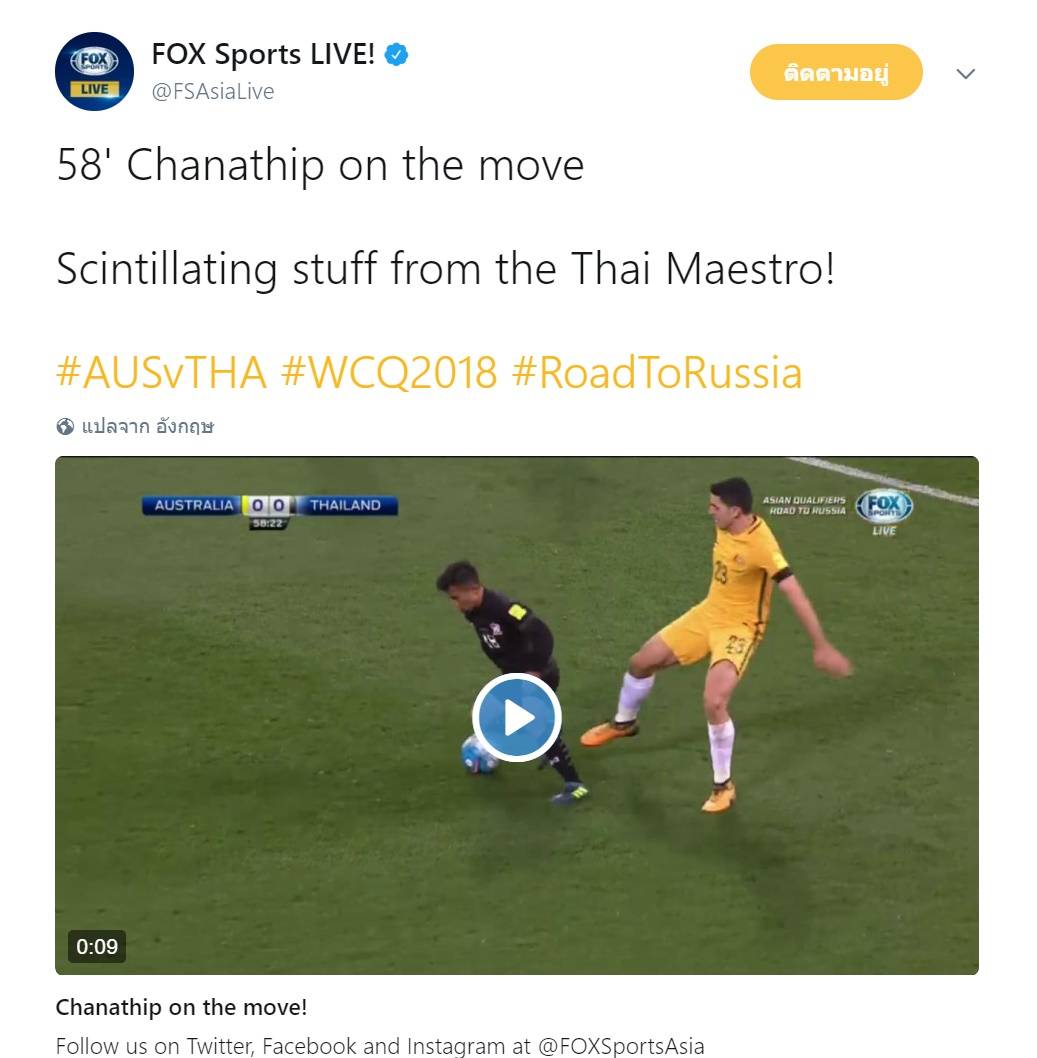 ชนาธิป สรงกระสินธ์ แสดงให้เห็นความสามารถที่ยอดเยี่ยม หวังพาบอลฝ่าวงล้อมแข้งออสเตรเลียในเกมฟุตบอลโลก 2018 รอบคัดเลือกเมื่อช่วงค่ำที่ผ่านมา