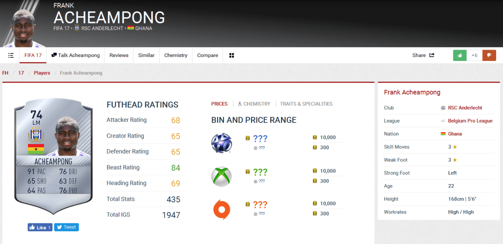 หลังย้ายจาก บุรีรัมย์ ไปค้าแข้งในยุโรปด้วยสถิติค่าตัวสูงสุดในประเทศไทยถึง 1 ล้านยูโร (ราว 39 ล้านบาท) เมื่อปี 2013 ปีกความเร็วสูงก็ได้อัพเกรดค่าพลังรวมขึ้นมาถึง 74 ในภาคนี้กับอันเดอร์เลชท์ ซึ่งมากที่สุดในเหล่าอดีตแข้งไทยลีก โดยดาวเตะชาวกานามีจุดเด่นอยู่ที่ความว่องไวและการเลี้ยงบอล โดยเขามีค่า Acceleration ที่สูงถึง 92 และ Sprint Speed ที่ 91และค่า Dribbling อยู่ที่ 76 และ Agility 83 นอกจากนี้สภาพร่างกายของเขากก็ยอดเยี่ยมไม่แพ้กัน เมื่อมีค่า Jumping ที่ 91, Stamina 91 และ Balance สูงถึง 90 เลยทีเดียว