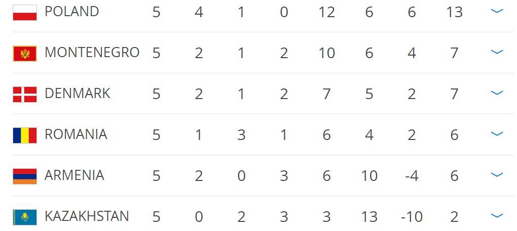 Đội tuyển Ba Lan đang thể hiện sức mạnh tuyệt đối của mình khi đang có 13 điểm sau 5 lượt trận, bỏ xa các đối thủ cạnh tranh. Cuộc chiến cho vị trí thứ hai đang diễn ra hết sức quyết liệt khi có đến bốn đội bóng cạnh tranh với nhau là Montenegro, Đan Mạch, Romania và Armenia với khoảng cách chỉ là một điểm.
