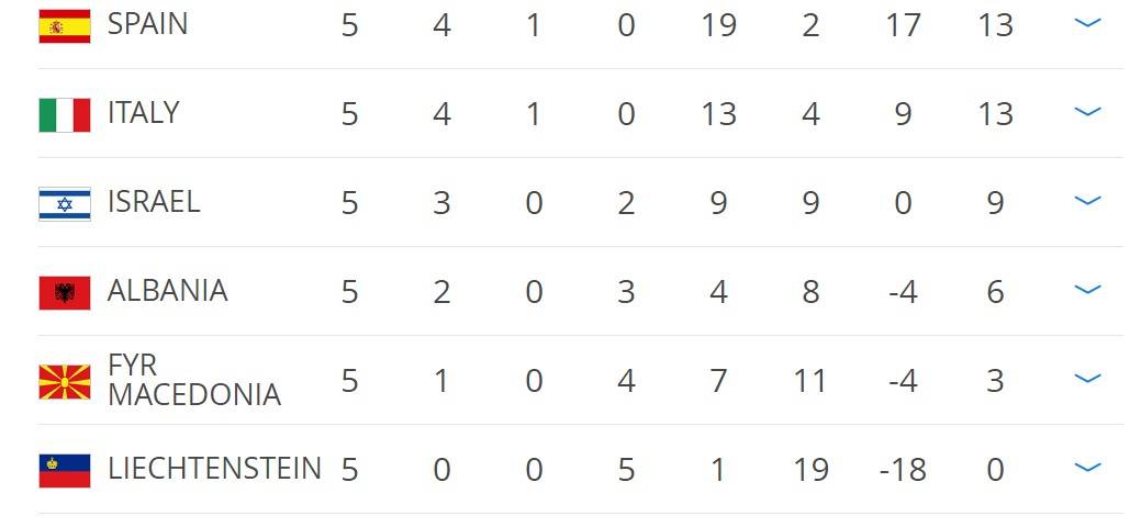 Bảng đấu có sự góp mặt của hai ông lớn Tây Ban Nha và Italia, cả hai đang có cùng điểm số và gần như chắc chắn sẽ là hai đội giành quyền đi tiếp khi các đội xếp sau chỉ là những đối thủ trung bình yếu như Israel hay Albania.
