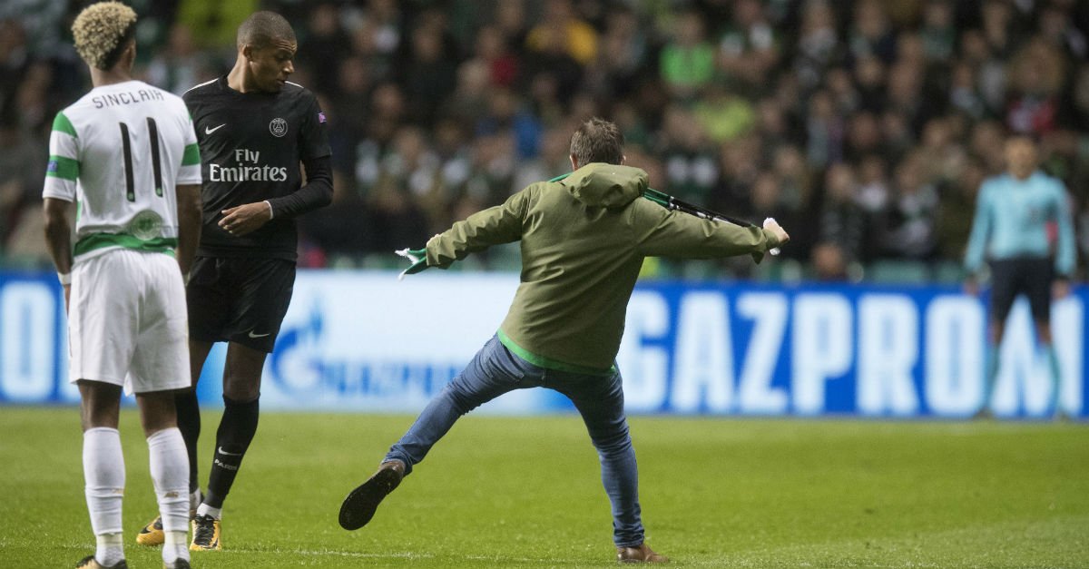 Một cổ động viên đã lao xuống sân Celtic Park và định “tung cước” vào người tiền đạo Kylian Mbappe của Paris Saint Germain. Tuy nhiên, người đàn ông này đã đá trượt và sau đó đã bị bảo vệ lôi ra ngoài.